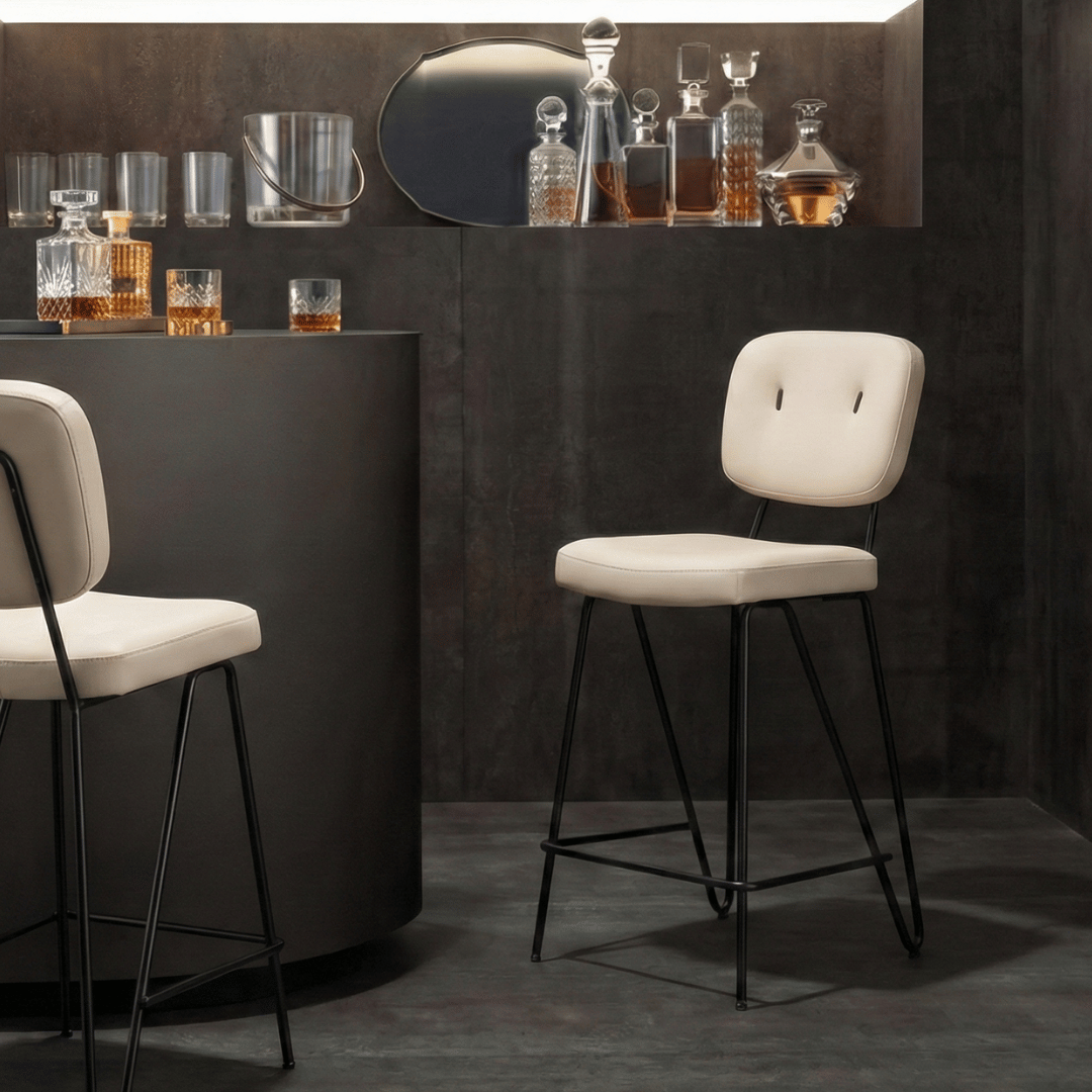 • June Bar este un scaun de bar cu design contemporan si aerisit, avand structura metalica subtire neagra, sezut tapitat in piele sau textil si spatar mare, rotunjit, cu detalii decorative negre integrate. Formele usor curbate si proportiile echilibrate asigura confort si stil, fiind ideal pentru baruri, insule de bucatarie sau dining-uri moderne. June Bar adauga functionalitate, eleganta si un accent urban oricarui interior.